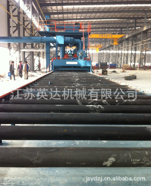 主要由輥道輸送系統(tǒng)、拋丸清理機(jī)、拋丸除塵系統(tǒng)、和電控系統(tǒng)所組成。其工作原理是:由輸送輥道送至封閉的拋丸清理室,,利用拋丸器高速旋轉(zhuǎn)的葉輪將鋼絲切丸(彈丸)加速拋射至工件表面,對工件表面進(jìn)行沖擊、刮削以清除工件表面的鐵銹和污物,然后利用橫掃、滾刷、收丸螺旋和高壓吹管將工件表面的積丸和浮塵吹掃干凈,由送出輥道送出,從而使鋼材達(dá)到除銹、防銹的目的。